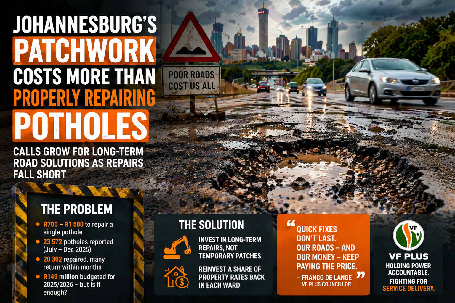 The City has allocated R149 million for pothole repairs in the 2025/2026 financial year. However, the Freedom Front Plus believes the issue lies not in the size of the budget, but in how it is spent.