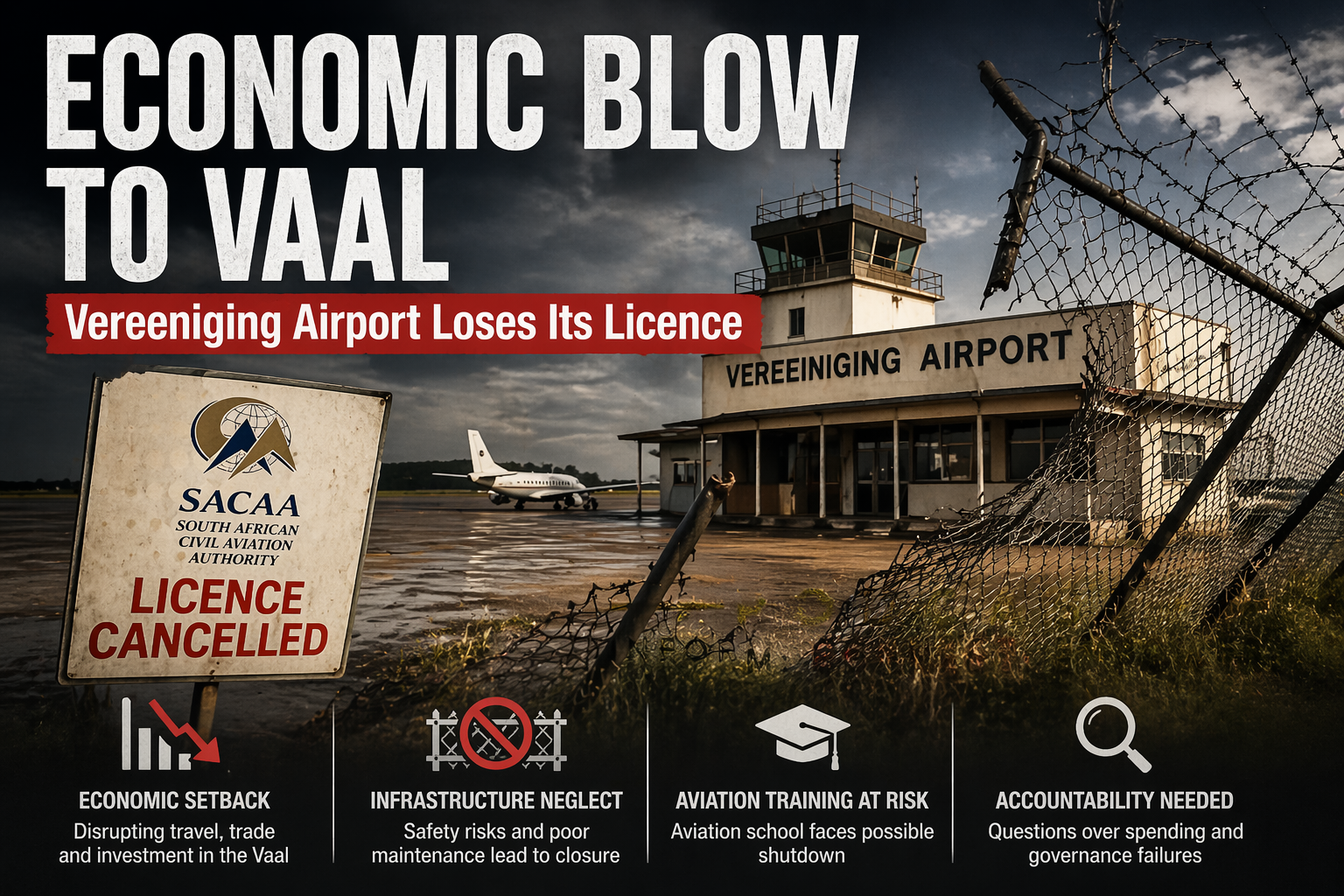 The Vaal region is facing a significant economic setback following the closure of Vereeniging Airport, after the South African Civil Aviation Authority (SACAA) officially revoked its operating licence due to safety concerns and deteriorating infrastructure.